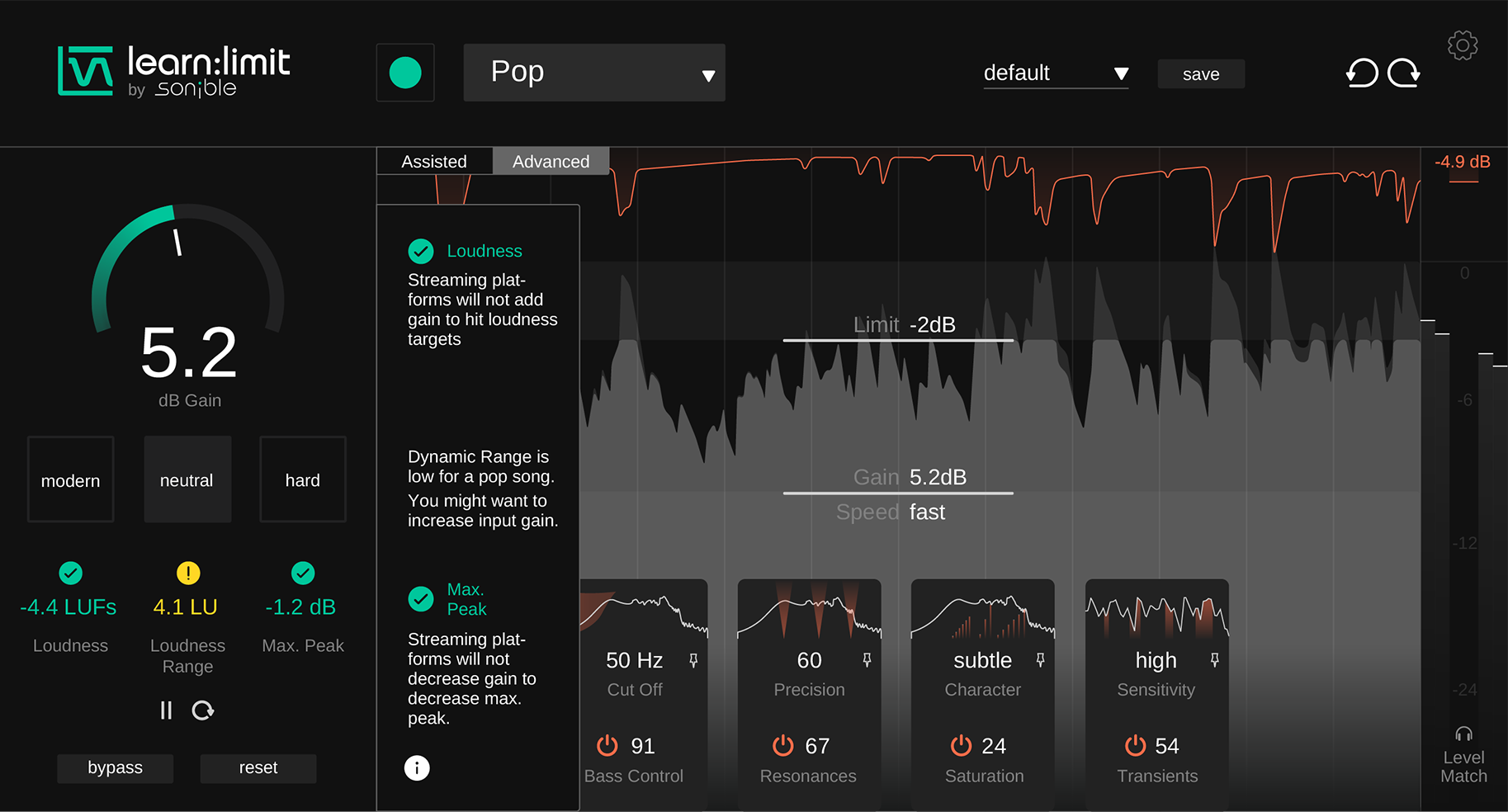 An intelligent limiter with built-in loudness monitoring and educational hints.